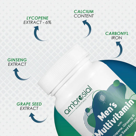 أمبروزيال مكمل غذائي متعدد الفيتامينات للرجال مع الليكوبين والجينسنغ وخلاصة بذور العنب – Ambrosial Men’s Multivitamin with Lycopene, Ginseng & Grape Seed Extract | 120 Tablets