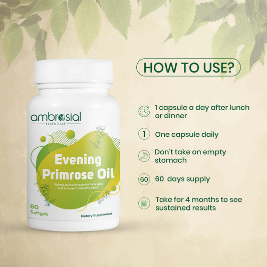زيت زهرة الربيع المسائية (EPO) 1000 ملغ | 120 كبسولة | مصدر غني بأوميغا 6 و GLA | غير معدّل وراثيًا وخالي من الغلوتين | بدون مواد حافظة صناعية | من أمبروسيال