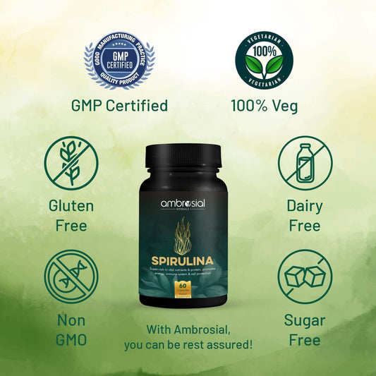 أمبروسيال سبيرولينا كبسولات سبيرولينا | جرعات عالية - 1000 مجم لكل جرعة | سبيرولينا معتمدة | بدون إضافات | نباتي 100٪ | مصدر غني بالبروتين والفيتامينات والمعادن