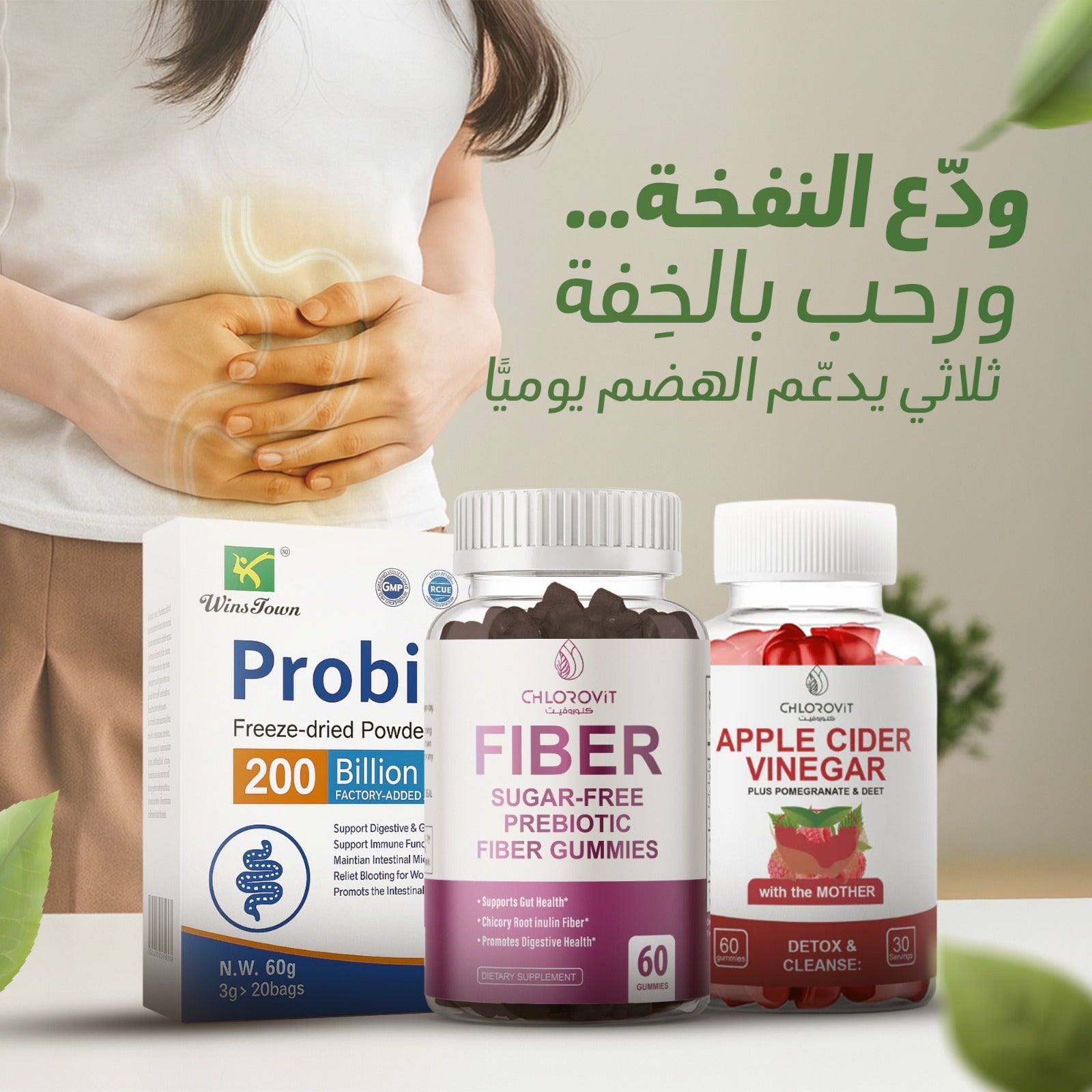 استمتع براحة يومية وتخلص من الانتفاخ مع باقة الهضم من Chlorovit. تركيبة متكاملة من البروبيوتيك + الألياف + خل التفاح لدعم صحة الجهاز الهضمي وتعزيز الأيض بشكل طبيعي وآمن.