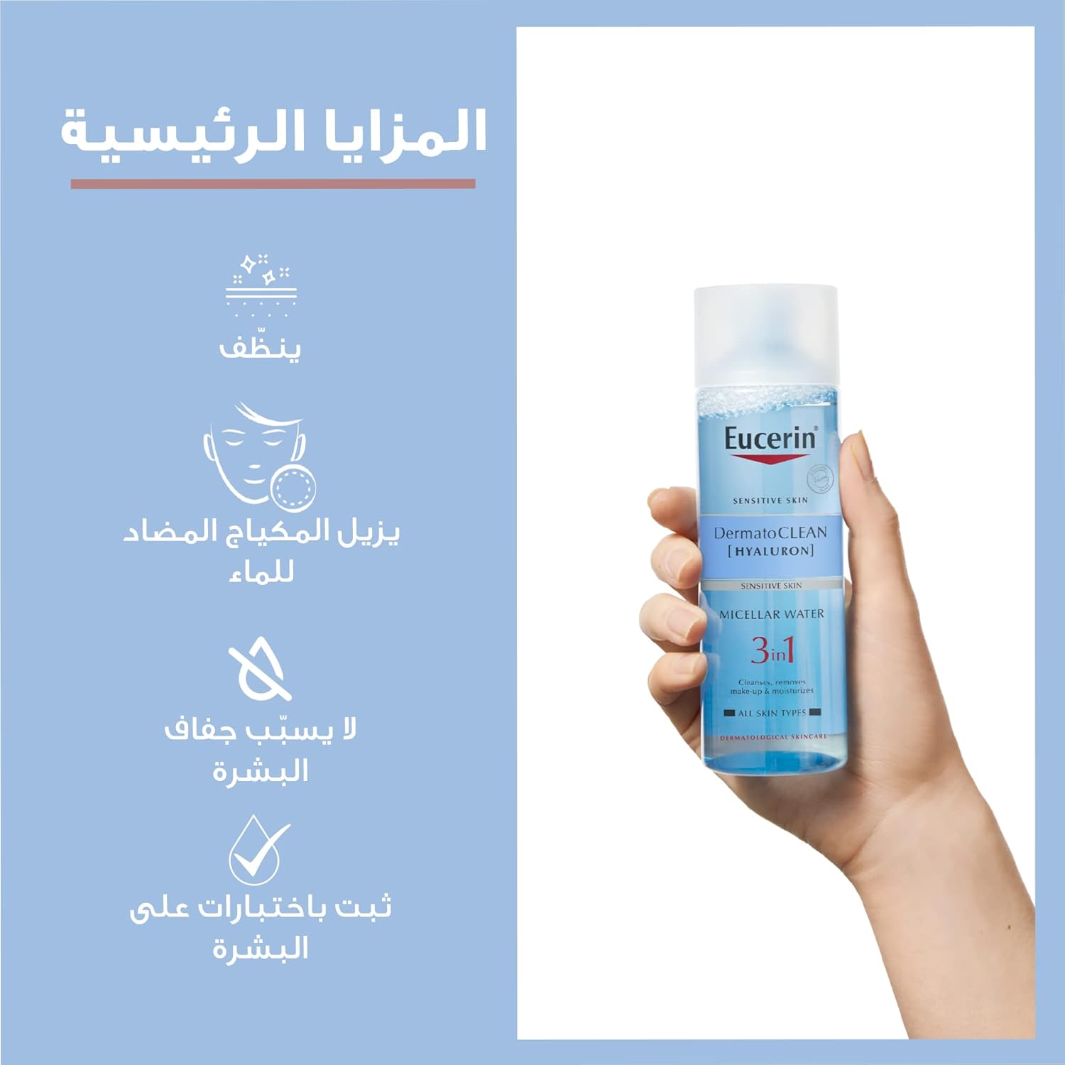 منظف الوجه بماء ميسيلار ماء ميسيلار Eucerin DermatoCLEAN [HYALURON] ماء ميسيلار 3 في 1 هو منظف للوجه لطيف وفعال في آن واحد يزيل الشوائب ومكياج الوجه والعينين دون أن يجفف البشرة. يجمع غسول ماء الميسيلار الذي نقدمه بين مركب منظف لطيف للغاية مع حمض الهيالورونيك ومكونات مرطبة أخرى مستمدة من الطبيعة لمساعدة البشرة على الحفاظ على توازن رطوبتها الطبيعية. يترك البشرة نظيفة ومنتعشة وناعمة. يعتبر Eucerin DermatoCLEAN [HYALURON] ماء ميسيلار ماء ميسيلار 3 في 1 Eucerin DermatoCLEAN [HYALURON] حل تنظيف سريع ومريح ومناسب لجميع أنواع البشرة، وقد أثبت سريريًا وجلديًا أنه مناسب للبشرة الحساسة.